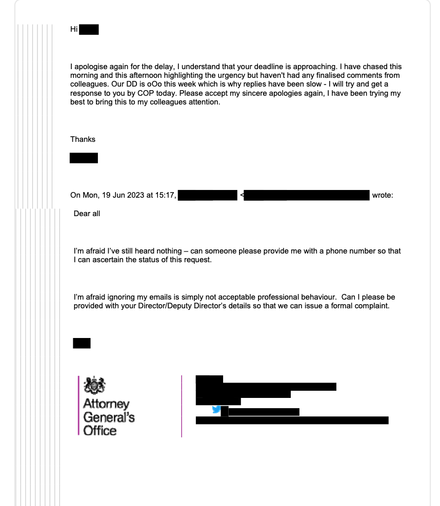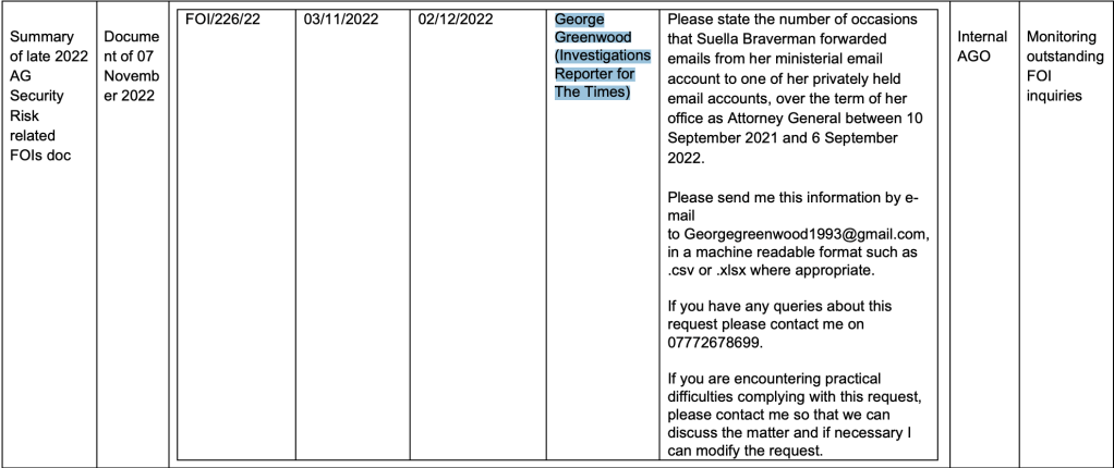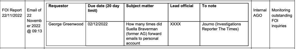 The way in which a request I made to the Attorney General’s Office (AGO) about Suella Braverman’s use of private emails whilst in ministerial office has to win some sort of award for being handled in the least applicant blind manner possible.