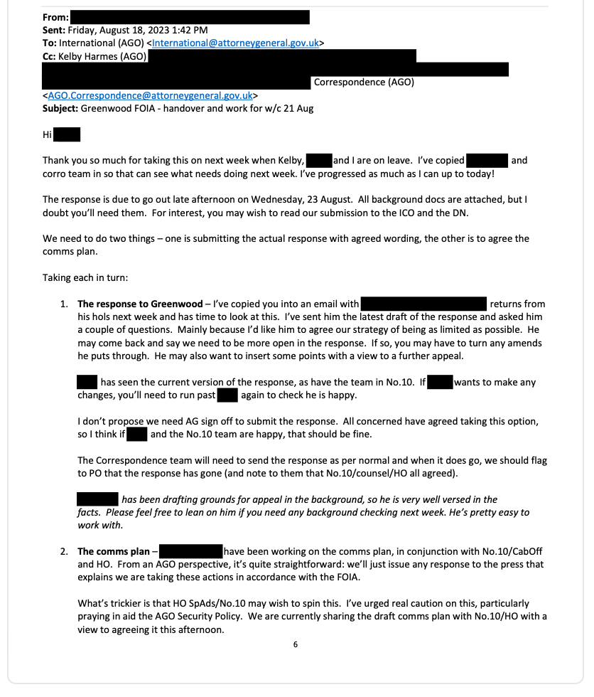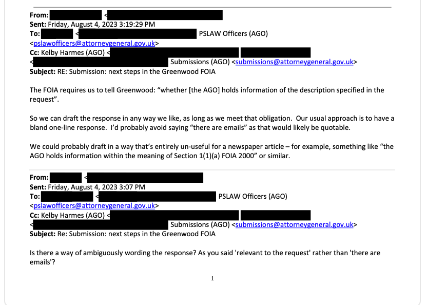 References in Cabinet Office emails to me as “the ever-active Mr Greenwood”, and in Department for Health and Social Care emails as “a serial requestor across the whole of government” who will “be quick to criticise us if we leave ambiguity”, are among the most stark breaches of the applicant blind principle I have seen to date.