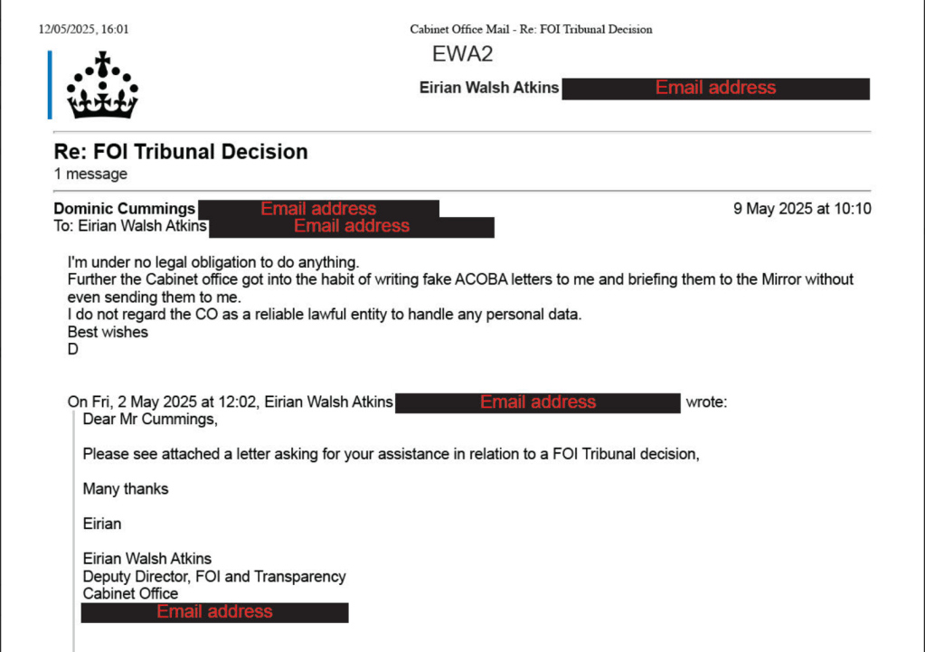The Cabinet Office continued to argue in the tribunal case, through taxpayer funded barristers, that sending Dominic Cummings an email asking him to conduct a search for any messages he might still have “as they did not consider this to be an exceptional circumstance.”