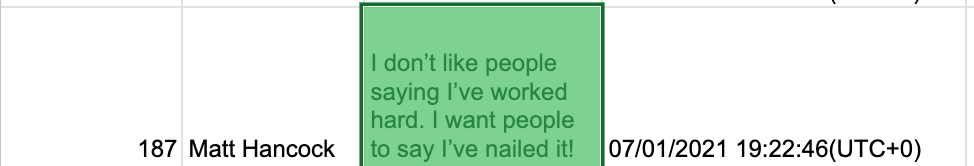 Hancock said of his pandemic performance that “I don’t like people saying I’ve worked hard. I want people to say I’ve nailed it!”, talked about “terrible” photos him used in the press, and described Rishi Sunak’s infamous hospitality recovery subsidy as “eat out to infect out”.